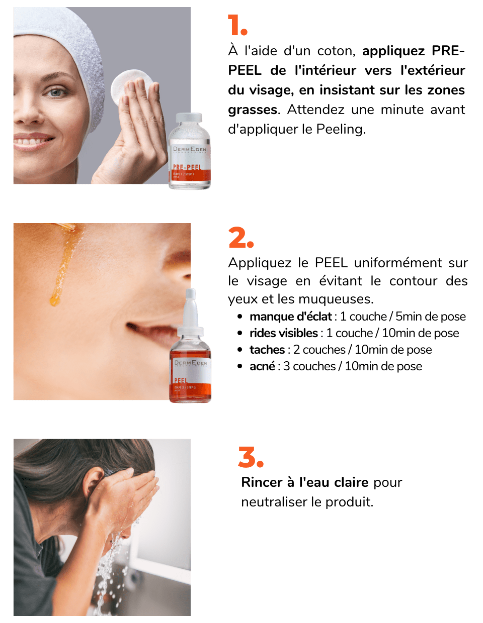 Etape 2 : Appliquer le PEEL uniformément sur le visage en évitant le contour des yeux et les muqueuses. Se rincer les mains à l’eau après application.